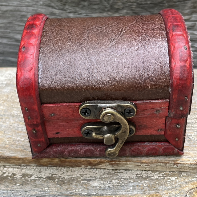 Ihana pieni aarrearkku pikku aarteille. Puuta, kansi päällystetty nahalla. Koko: 8 x 6x 6cm.