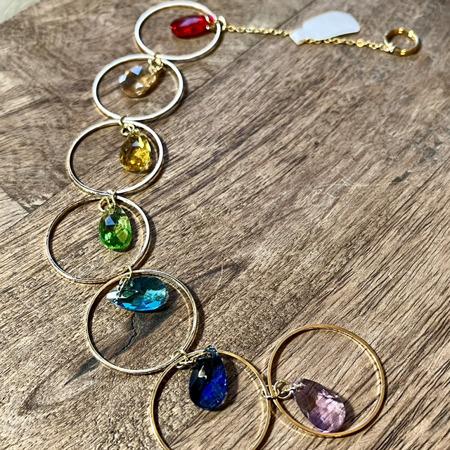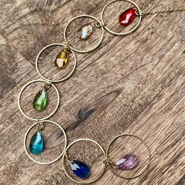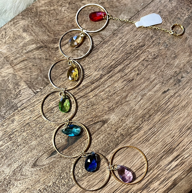 Upea kristalli aurinkosieppari chakran väreissä. Ripusta sieppari esim. ikkunaan auringonvaloon ja se heijastaa upeaa kristallienergiaa ja valoa huoneeseen.