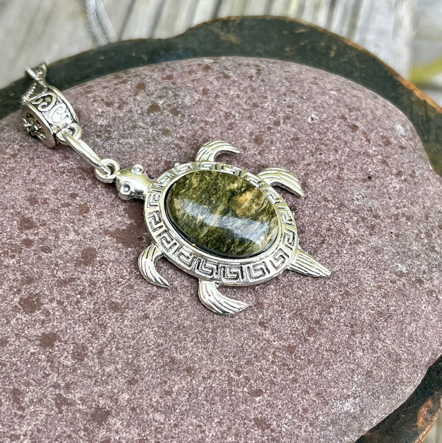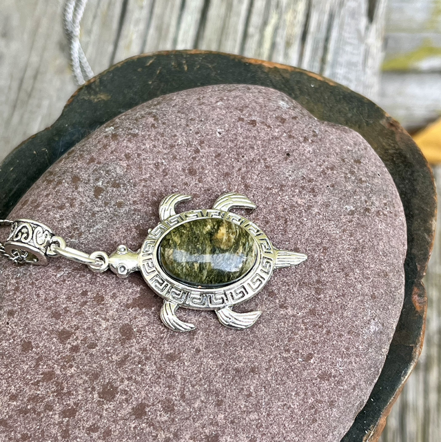 Kilpikonna riipus. Nikkelitön korumetalli. Riipuksen koko n. 3x 2,5cm. Kiven koko n.2x 1,8cm. Lukollinen kirurgin terästä oleva ketju 60cm.