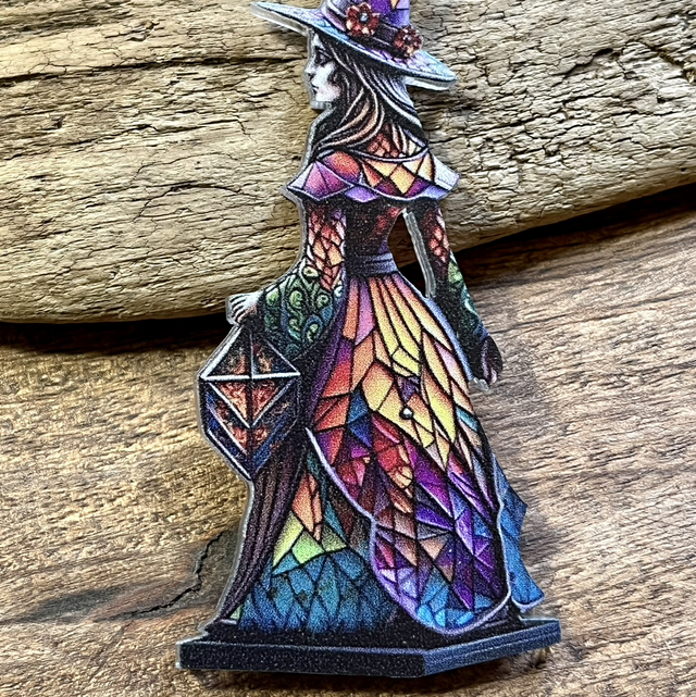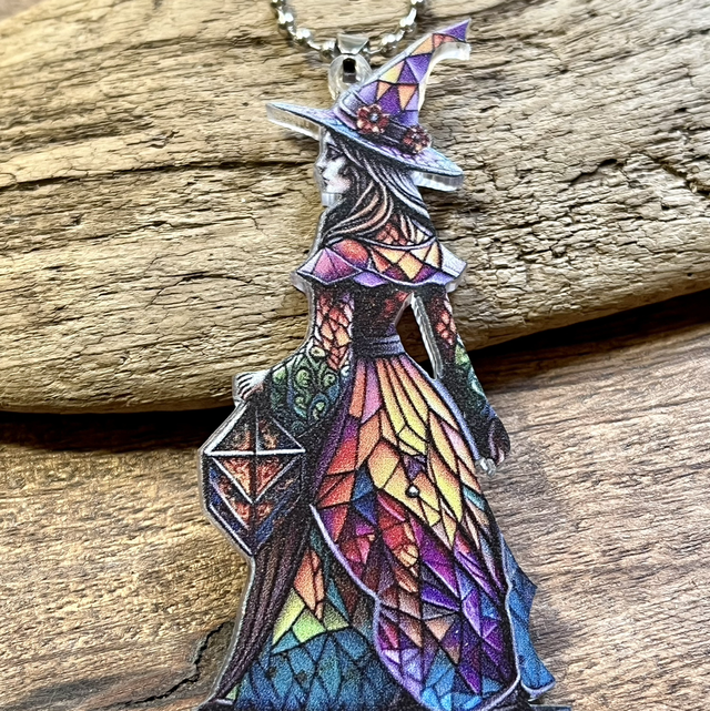 Akryyliä, Noidan koko: lev.3cm. ja pit.8cm. kokonaispituus ketjun kanssa: 30cm.