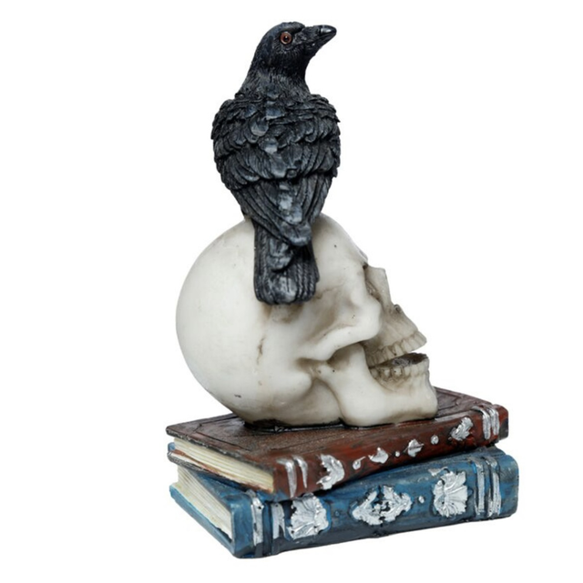Korppi patsas pääkallolla ja kirjoilla. Hartsia, koko: 10 x 6,5 x 4,6 cm.