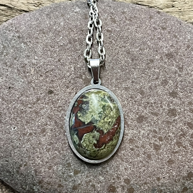 Soikea riipus kirurgin terästä. Riipuksen koko 3x2cm, kiven koko: 1,8x 2,4cm.