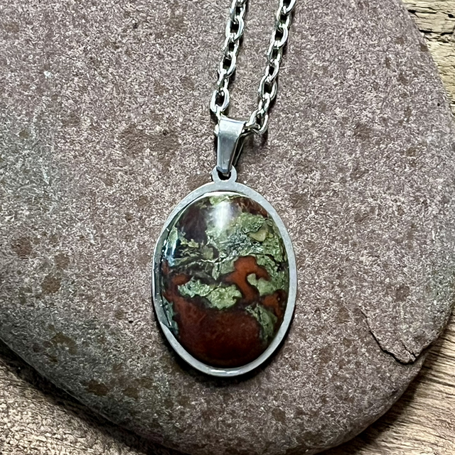 Soikea riipus kirurgin terästä. Riipuksen koko 3x2cm, kiven koko: 1,8x 2,4cm.