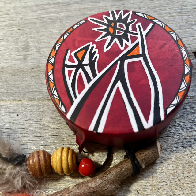 Rumpu valmistettu sitomalla, rumpu ei soi, tarkoitettu Amuletiksi esim. kodin suojaamiseksi. Eri symboolien tarkoitus selitetty auki rummun mukana. Handmade. Jokainen on uniikkikappale.