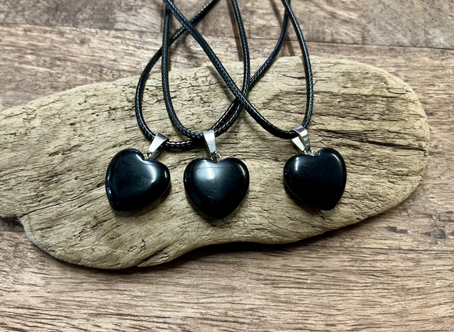 Kivisydän riipus. Kiven koko n.2,5 x2cm. Ketju musta vahattu nyöri, pituus 60cm.