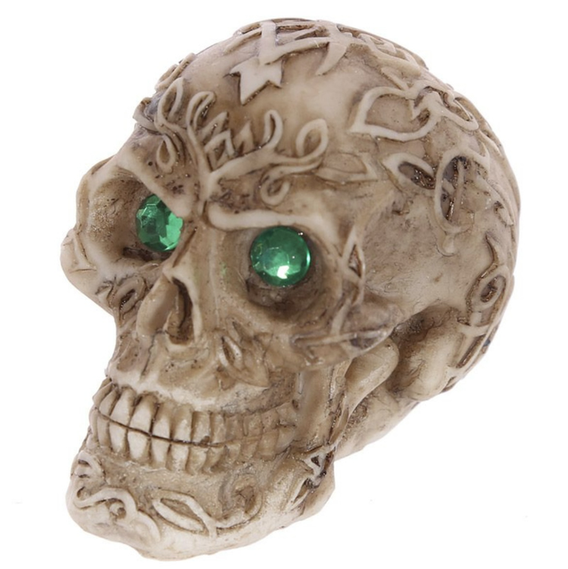 Pääkallot ”jalokivi” silmillä. Kalloissa kelttiläisiä kuvioita, valitse silmien väri valikosta. Hartsia, koko: 7x 5cm