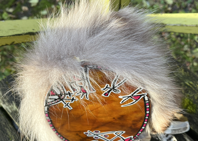 Mukaan tulee soittokapula, hoito-ohjeet ja rummun tarina auki kirjoitettuna. Karva rummun ympärillä värjättyä Kettua, tassussa kynnet mukana.
