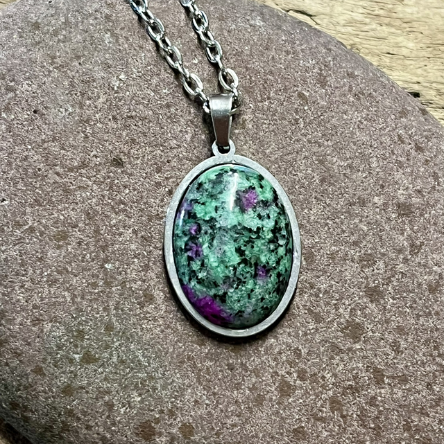 Soikea riipus kirurgin terästä. Riipuksen koko 3x2cm, kiven koko: 1,8x 2,4cm.