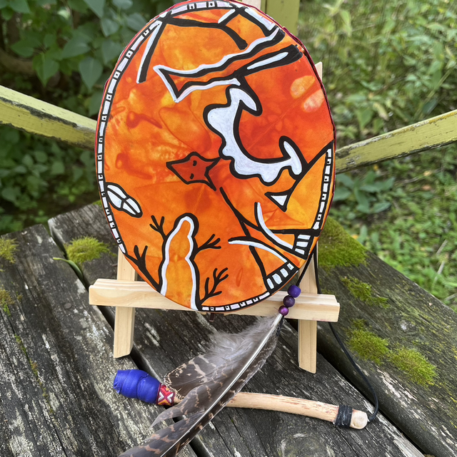 Mukaan tulee soittokapula, hoito-ja viritys ohjeet ja rummun tarina auki kirjoitettuna.