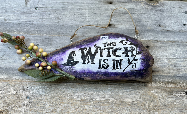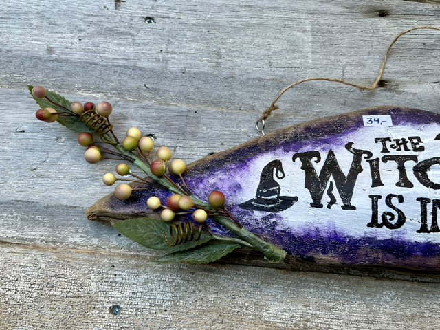 Käsinmaalattu uniikki Witch is in -kyltti ajopuulle.